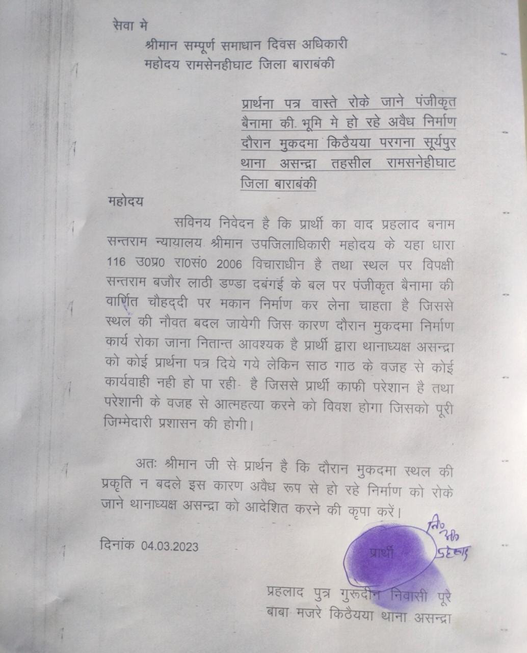 प्राप्त जानकारी अनुसार कोतवाली असंद्रा क्षेत्र के पूरे बाबा मजरे किठैया निवासी प्रह्लाद का आरोप है कि मेरी एक जमीन का मुकदमा धारा 116 उप्र रा०स० 2006 विचाराधीन है फिर भी विपक्षी जमीन पर अवैध निर्माण कर रहे है जिसे रुकवाने खातिर कई बार प्रार्थना पत्र थाना असंद्रा प्रभारी को दिए लेकिन पुलिस ने साठगांठ कर कोई कारवाई नही कर रही है जिससे परेशान होकर मै आत्म हत्या कर लूंगा जिसकी जिम्मेदारी शासन प्रशासन की होगी।बुजुर्ग के प्रार्थना पत्र पर त्वरित संज्ञान लेने का आदेश भी जिलाधिकारी द्वारा दिया गया।